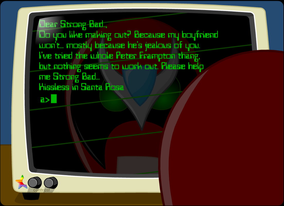 In what will soon become an uncharacteristic move, Strong Bad brings up one of his famous songs, “You’re Really Ugly (But There’s Nobody Cute Around)”. This is not one of the songs from the Strong Bad Sings cartoon, nor is it on the CD. In fact, we never get to hear it. However, this is the first in a long series of instances where Strong Bad claims to be great with the ladies. We have little to no evidence that he actually is.